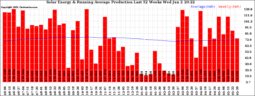 20210602 Weekly Solar Energy Production Running Average Last 52 Weeks