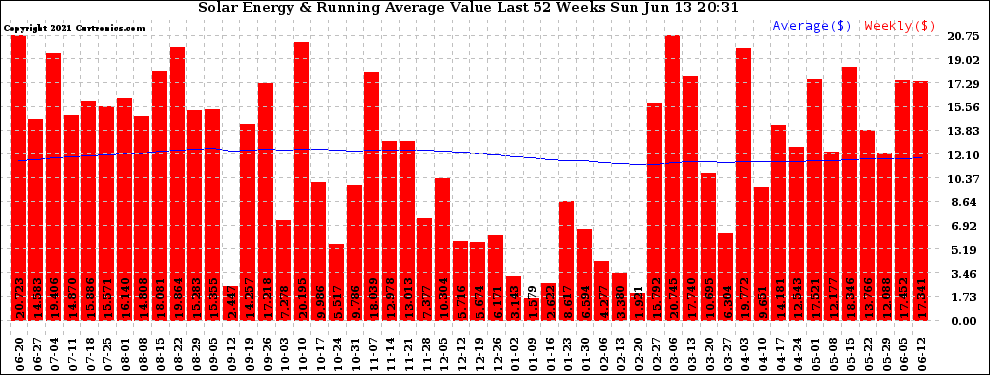 20210613 Weekly Solar Energy Production Value Running Average Last 52 Weeks