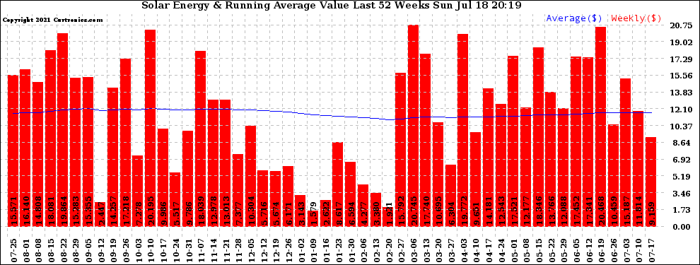 20210718 Weekly Solar Energy Production Value Running Average Last 52 Weeks