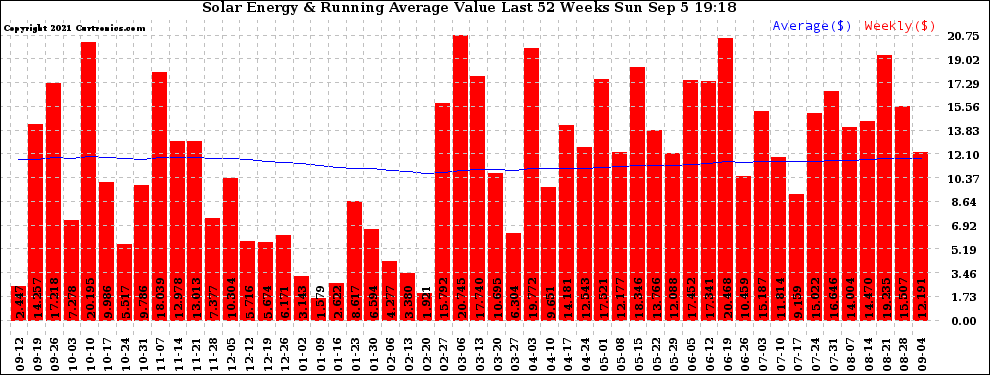 20210905 Weekly Solar Energy Production Value Running Average Last 52 Weeks