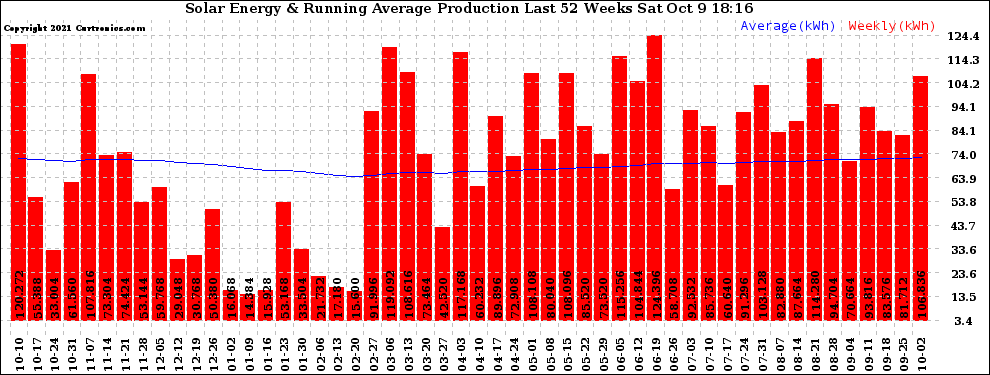 20211009 Weekly Solar Energy Production Running Average Last 52 Weeks