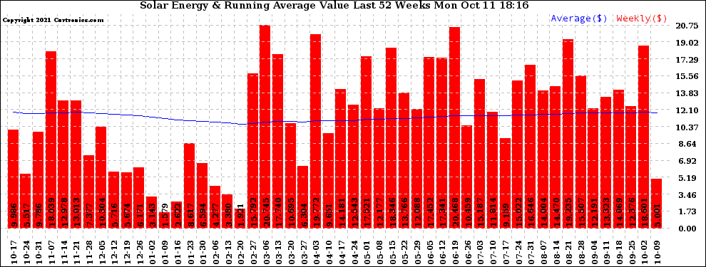 20211011 Weekly Solar Energy Production Value Running Average Last 52 Weeks