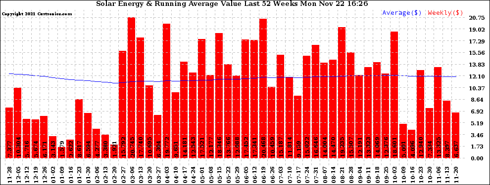 20211122 Weekly Solar Energy Production Value Running Average Last 52 Weeks