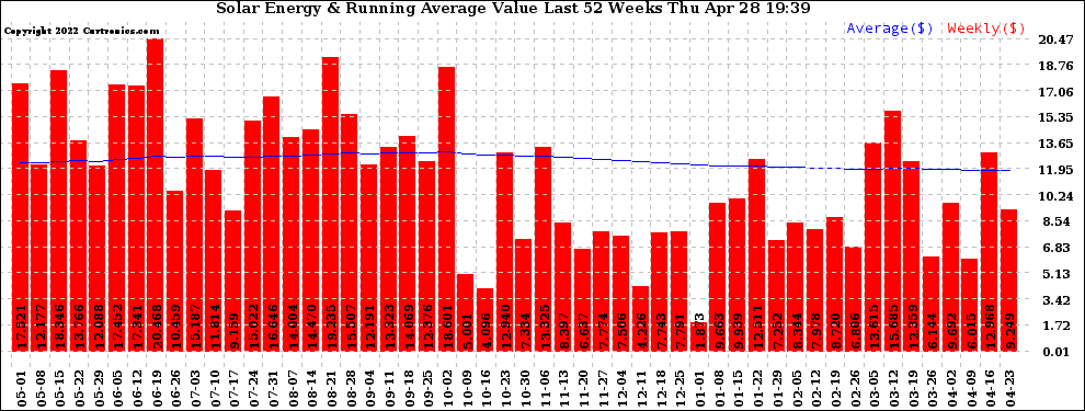 20220428 Weekly Solar Energy Production Value Running Average Last 52 Weeks
