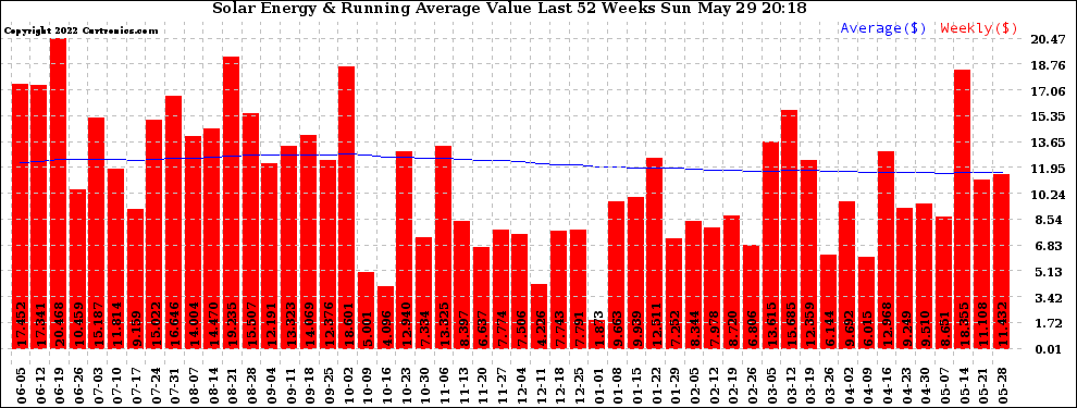 20220529 Weekly Solar Energy Production Value Running Average Last 52 Weeks