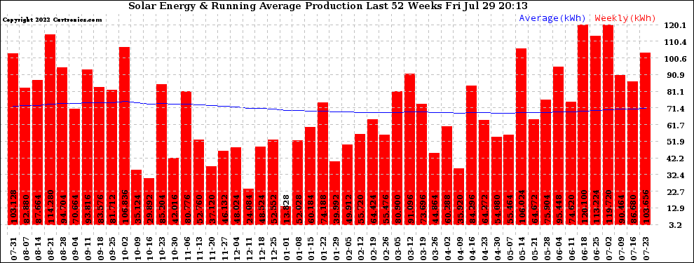 20220729 Weekly Solar Energy Production Running Average Last 52 Weeks