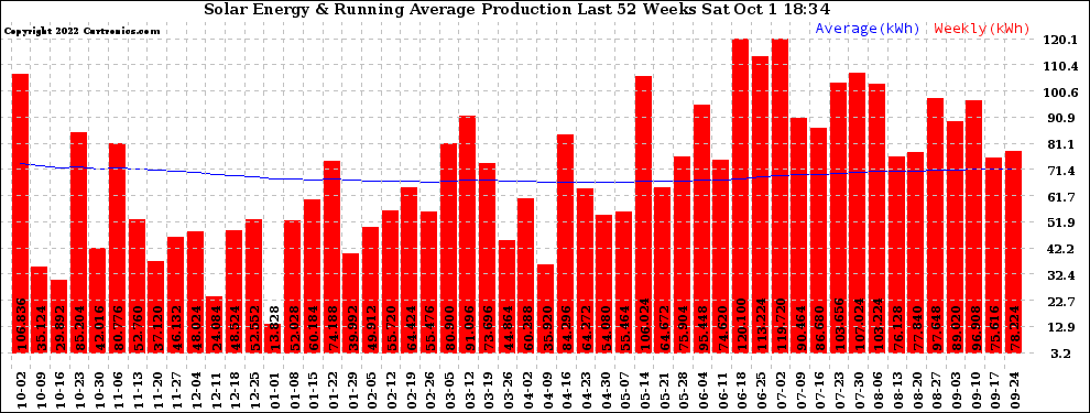 20221001 Weekly Solar Energy Production Running Average Last 52 Weeks