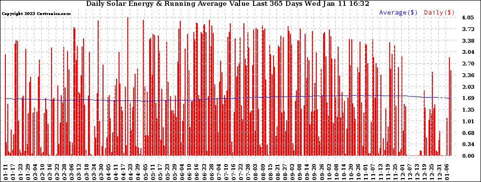 20230111 Daily Solar Energy Production Value Running Average Last 365 Days