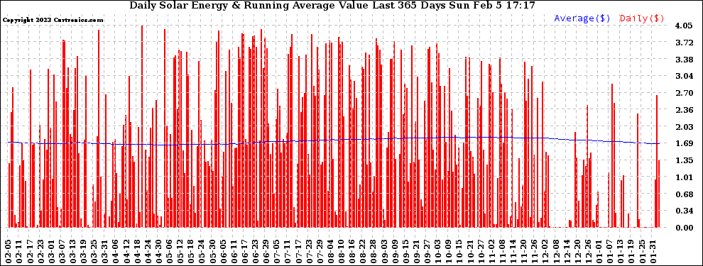20230205 Daily Solar Energy Production Value Running Average Last 365 Days