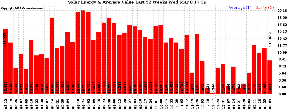 20230308 Weekly Solar Energy Production Value Last 52 Weeks
