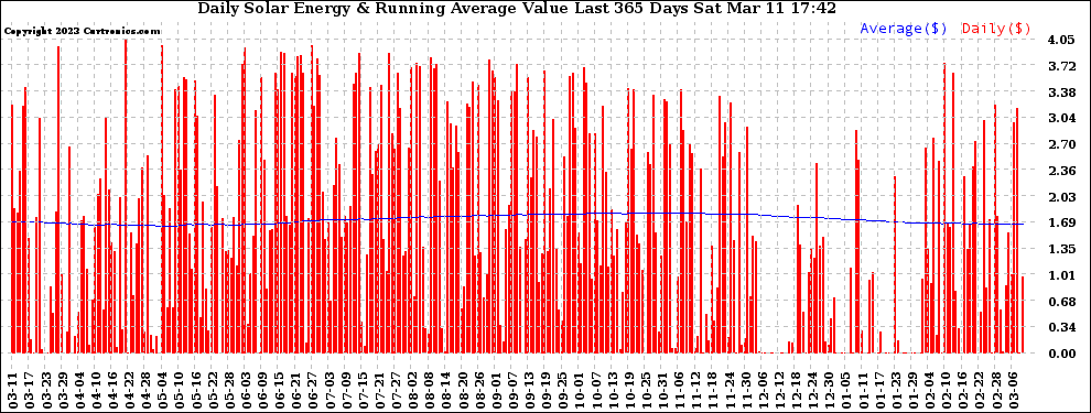20230311 Daily Solar Energy Production Value Running Average Last 365 Days