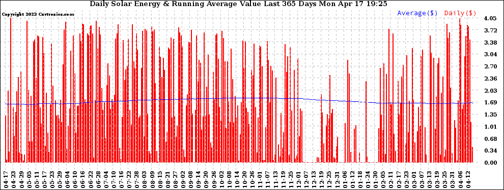 20230417 Daily Solar Energy Production Value Running Average Last 365 Days