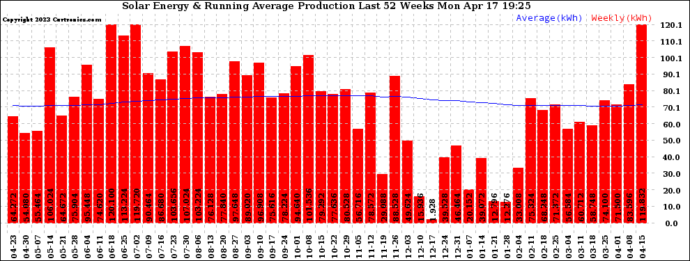 20230417 Weekly Solar Energy Production Running Average Last 52 Weeks