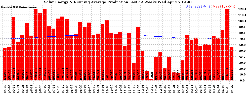 20230426 Weekly Solar Energy Production Running Average Last 52 Weeks