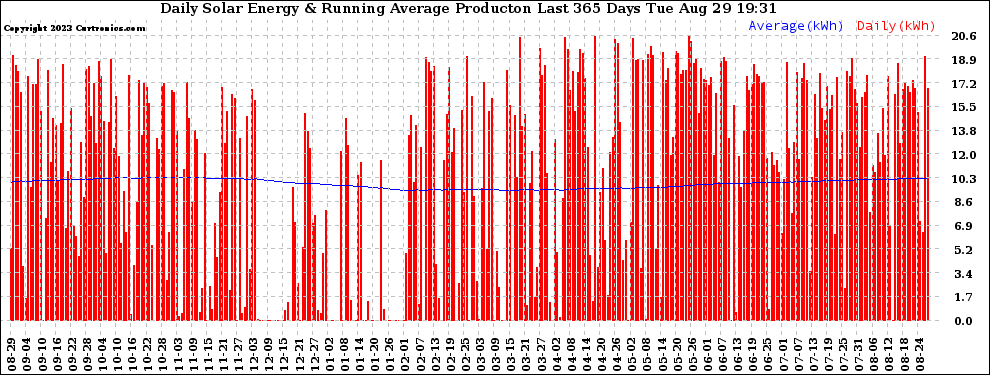 20230829 Daily Solar Energy Production Running Average Last 365 Days