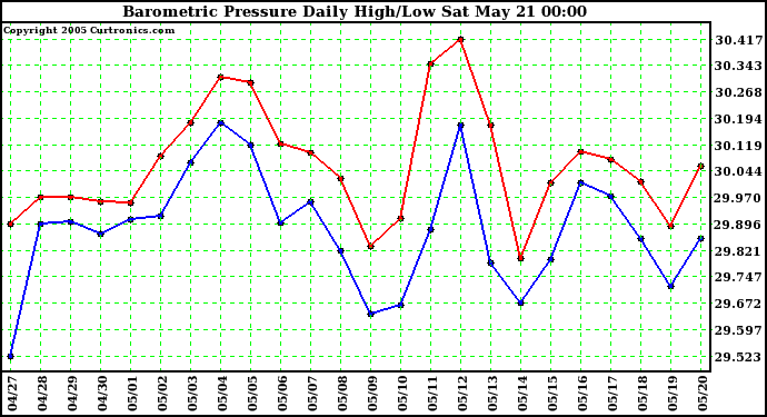 Milwaukee Weather -- 20050520 Barometric Pressure Daily High/Low -- Brought to you by curtronics.com