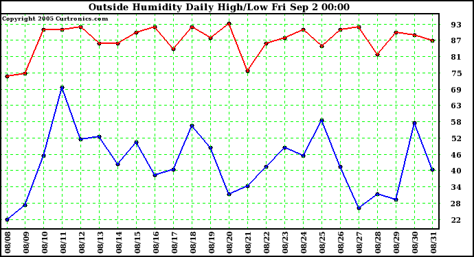 Milwaukee Weather -- 20050901 Outside Humidity Daily High/Low -- Brought to you by curtronics.com