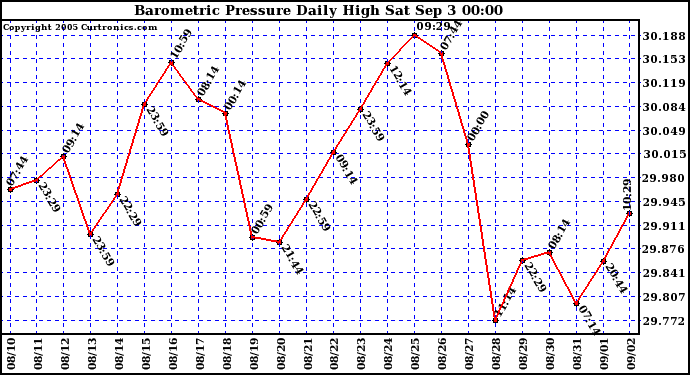 Milwaukee Weather -- 20050902 Barometric Pressure Daily High -- Brought to you by curtronics.com