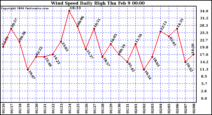 Milwaukee Weather -- 20060208 Wind Speed Daily High -- From curtronics.com by Curt Blank