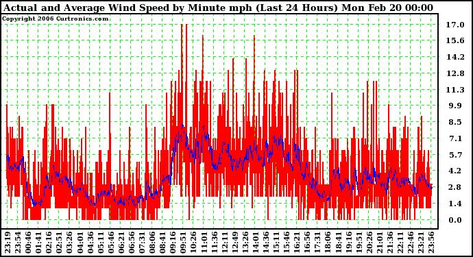 Milwaukee Weather -- 20060219 Actual and Average Wind Speed by Minute mph (Last 24 Hours) -- From curtronics.com by Curt Blank