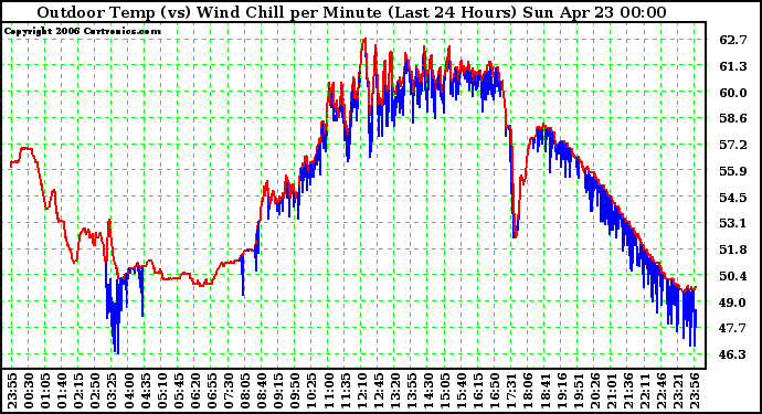 Milwaukee Weather -- 20060422 Outdoor Temp (vs) Wind Chill per Minute (Last 24 Hours) -- From curtronics.com by Curt Blank