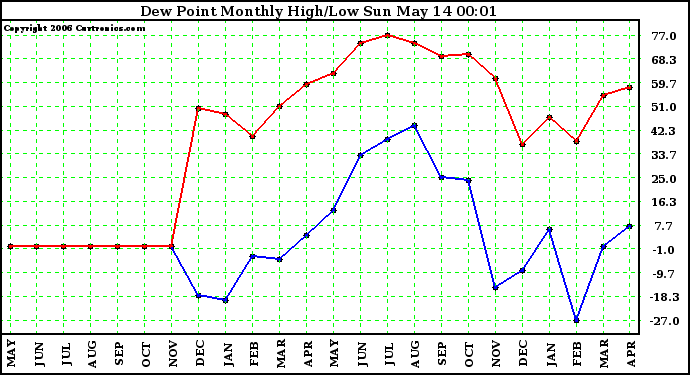 Milwaukee Weather -- 20060513 Dew Point Monthly High/Low -- From curtronics.com by Curt Blank