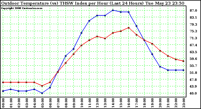 Milwaukee Weather -- 20060523 Outdoor Temperature (vs) THSW Index per Hour (Last 24 Hours) -- From curtronics.com by Curt Blank
