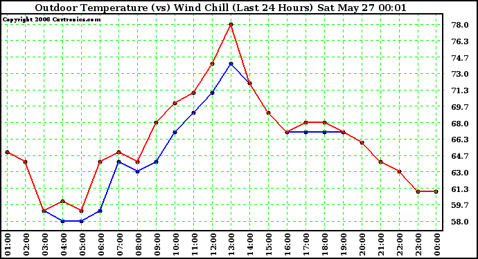 20060526 Outdoor Temperature (vs) Wind Chill (Last 24 Hours)