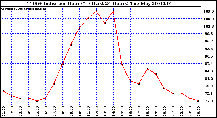 Milwaukee Weather -- 20060529 THSW Index per Hour (°F) (Last 24 Hours) -- From curtronics.com by Curt Blank
