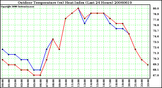 20060619 Outdoor Temperature (vs) Heat Index (Last 24 Hours)