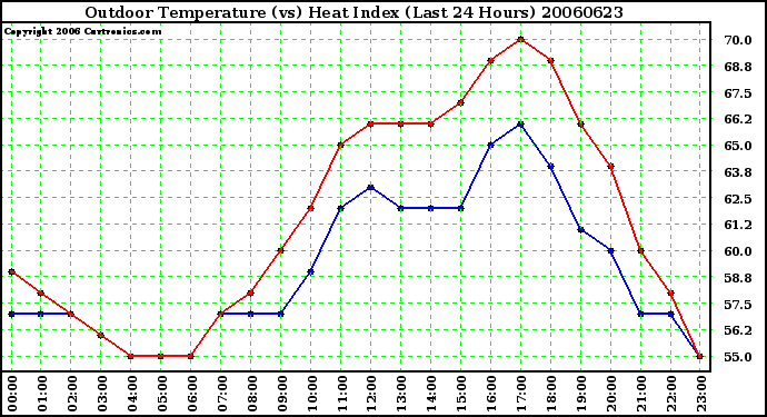Milwaukee Weather -- 20060623 Outdoor Temperature (vs) Heat Index (Last 24 Hours) -- From curtronics.com by Curt Blank