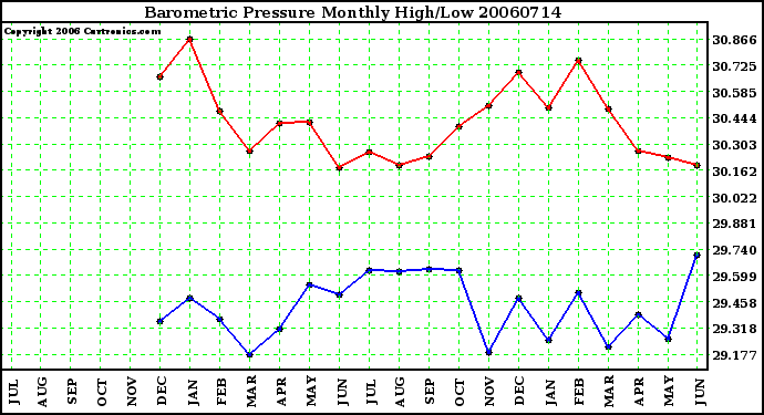 Milwaukee Weather -- 20060714 Barometric Pressure Monthly High/Low -- From curtronics.com by Curt Blank