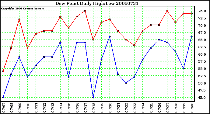 Milwaukee Weather -- 20060731 Dew Point Daily High/Low -- From curtronics.com by Curt Blank
