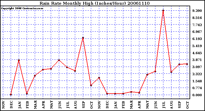 Milwaukee Weather -- 20061110 Rain Rate Monthly High (Inches/Hour) -- From curtronics.com by Curt Blank