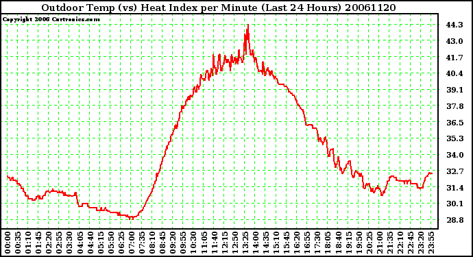 Milwaukee Weather -- 20061120 Outdoor Temp (vs) Heat Index per Minute (Last 24 Hours) -- From curtronics.com by Curt Blank