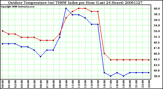Milwaukee Weather -- 20061127 Outdoor Temperature (vs) THSW Index per Hour (Last 24 Hours) -- From curtronics.com by Curt Blank