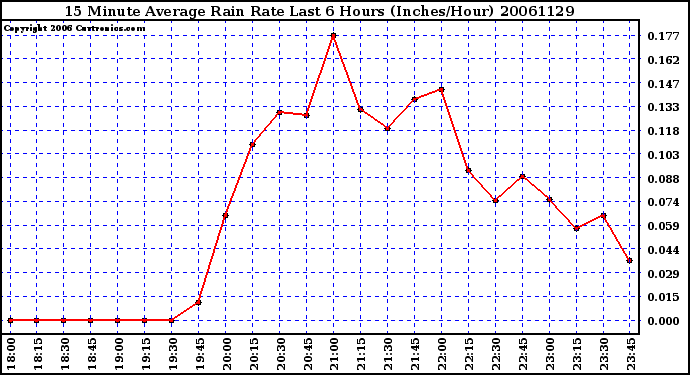 20061129 15 Minute Average Rain Rate Last 6 Hours (Inches/Hour)