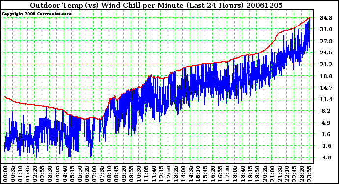 Milwaukee Weather -- 20061205 Outdoor Temp (vs) Wind Chill per Minute (Last 24 Hours) -- From curtronics.com by Curt Blank