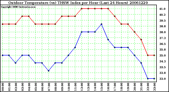 Milwaukee Weather -- 20061229 Outdoor Temperature (vs) THSW Index per Hour (Last 24 Hours) -- From curtronics.com by Curt Blank