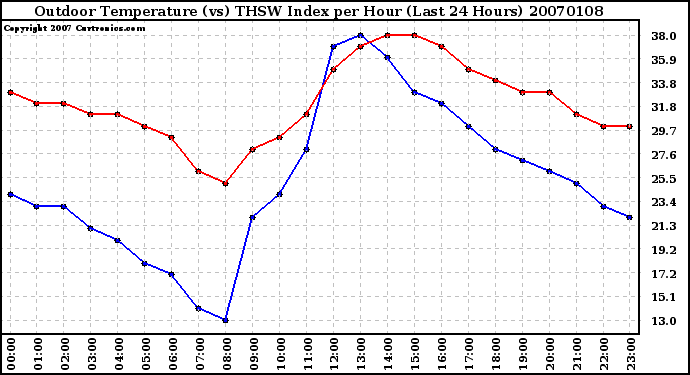 Milwaukee Weather -- 20070108 Outdoor Temperature (vs) THSW Index per Hour (Last 24 Hours) -- From curtronics.com by Curt Blank