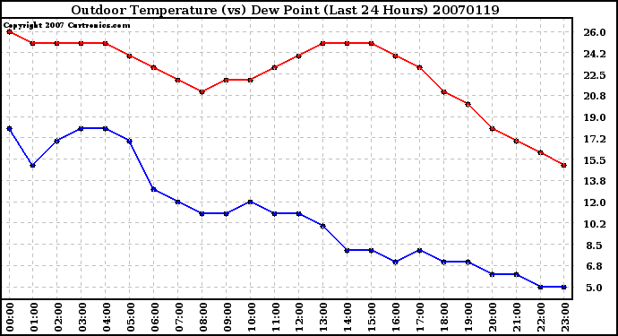 20070119 Outdoor Temperature (vs) Dew Point (Last 24 Hours)