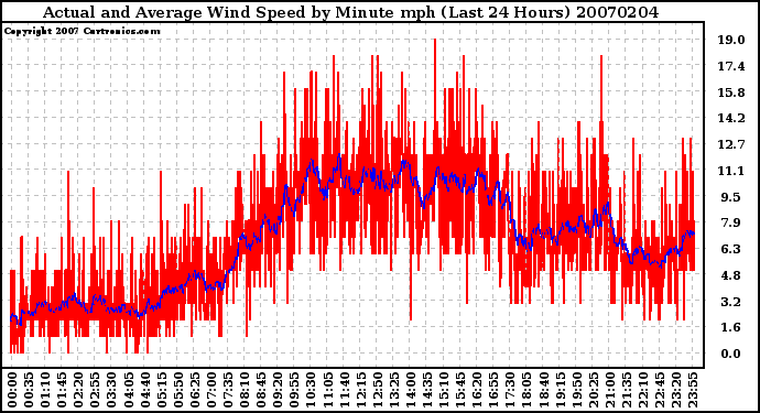 Milwaukee Weather -- 20070204 Actual and Average Wind Speed by Minute mph (Last 24 Hours) -- From curtronics.com by Curt Blank