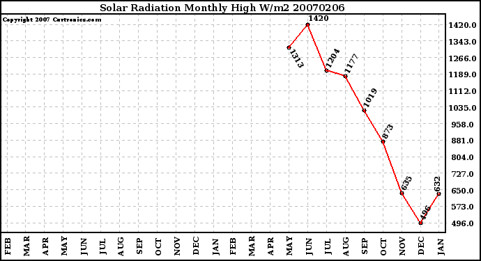 Milwaukee Weather -- 20070206 Solar Radiation Monthly High W/m2 -- From curtronics.com by Curt Blank