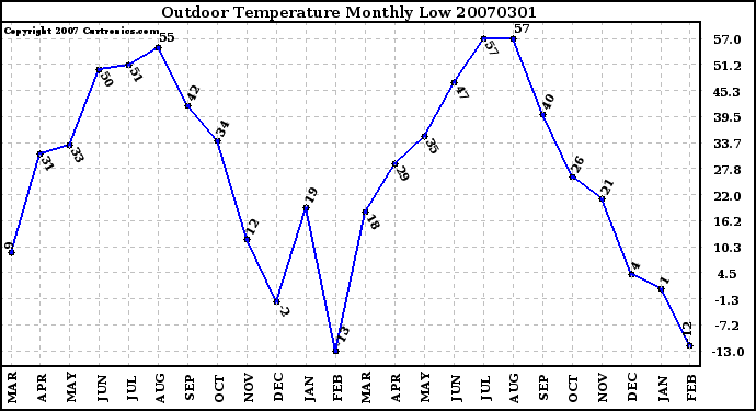 Milwaukee Weather -- 20070301 Outdoor Temperature Monthly Low -- From curtronics.com by Curt Blank