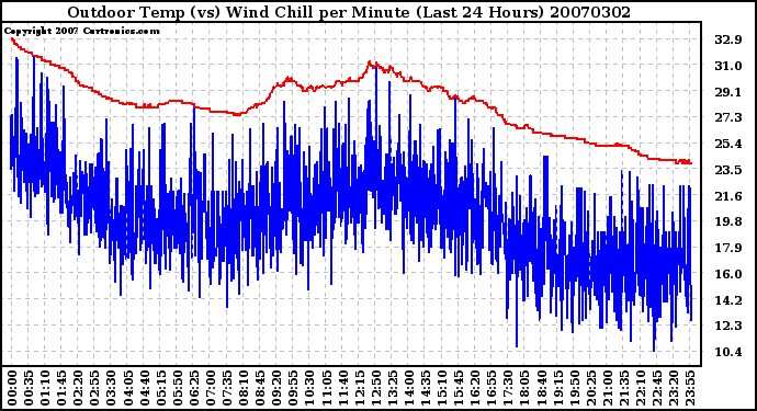 Milwaukee Weather -- 20070302 Outdoor Temp (vs) Wind Chill per Minute (Last 24 Hours) -- From curtronics.com by Curt Blank