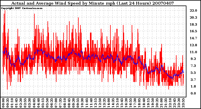 20070407 Actual and Average Wind Speed by Minute mph (Last 24 Hours)
