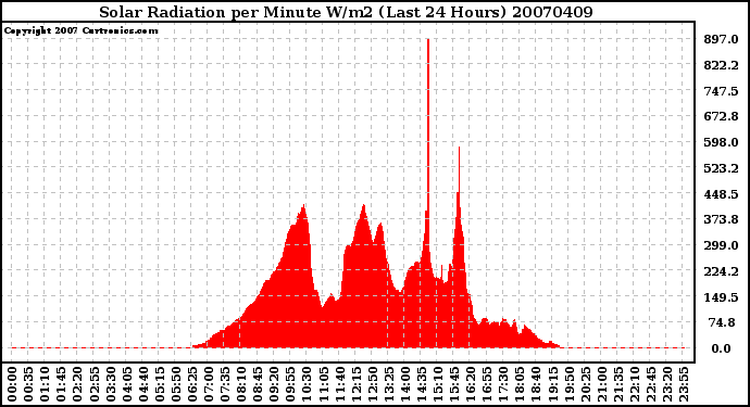 Milwaukee Weather -- 20070409 Solar Radiation per Minute W/m2 (Last 24 Hours) -- From curtronics.com by Curt Blank