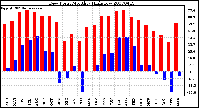 Milwaukee Weather -- 20070413 Dew Point Monthly High/Low -- From curtronics.com by Curt Blank