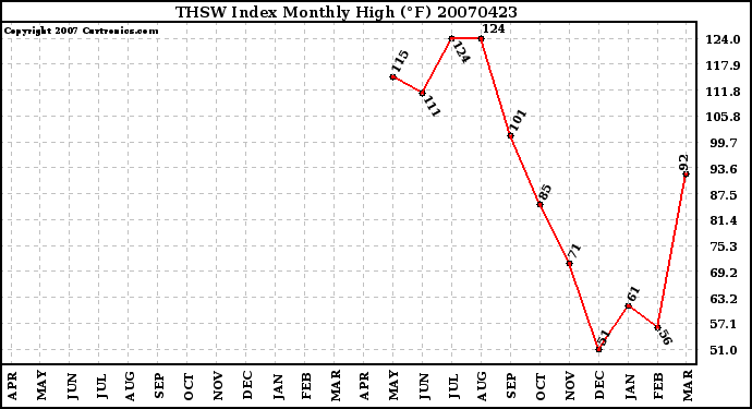 Milwaukee Weather -- 20070423 THSW Index Monthly High (°F) -- From curtronics.com by Curt Blank