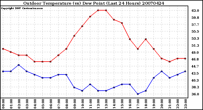 Milwaukee Weather -- 20070424 Outdoor Temperature (vs) Dew Point (Last 24 Hours) -- From curtronics.com by Curt Blank